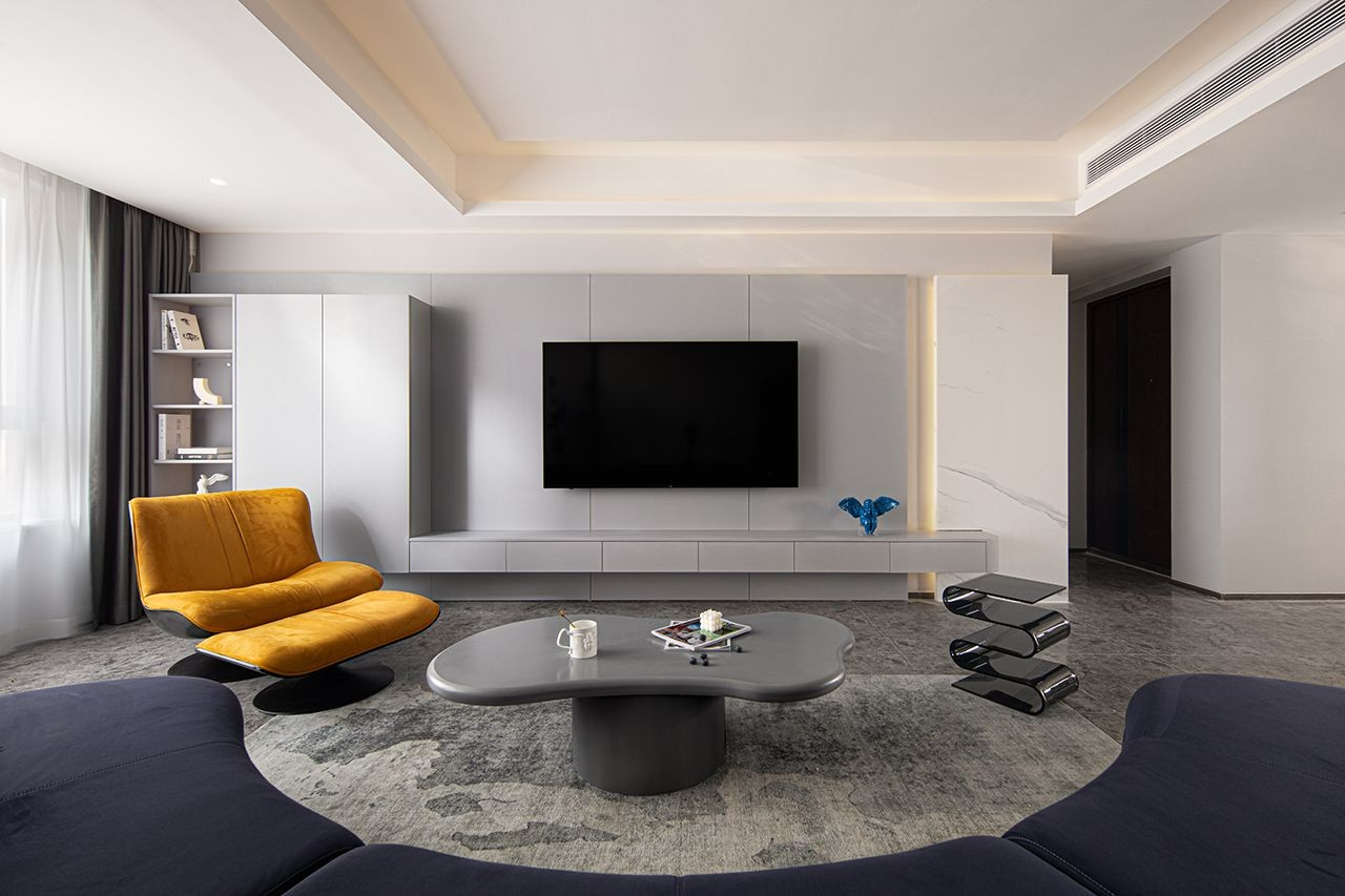 静谧的色彩为空间奠定了优雅而温煦的基调,浅灰色与乳白的墙壁散发着温馨的暖意。 电视背景墙上做了悬空储物柜的设计,兼具功能性与审美特征,柔和的暖色光源从墙间的灯带中溢出,传达出一丝极为惬意的生活情调。
