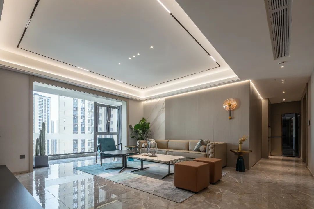 客厅选择了无主灯设计,用简单的线条与灯光营造出舒适的休闲空间。