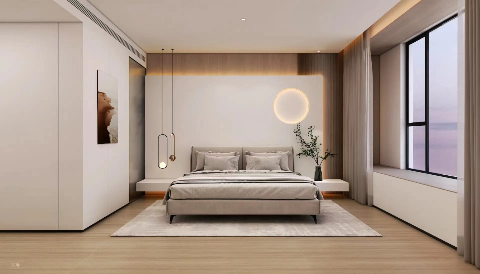 木地板衬托温馨,背景用线性灯,显示空间层次感