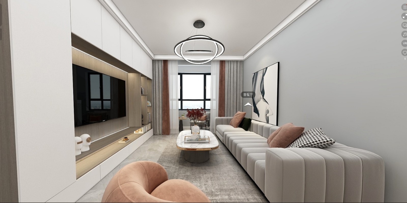 电视柜采用地柜加吊柜形式,强化储物空间。玄关柜做转角,将冰箱包进去,空间整体化。