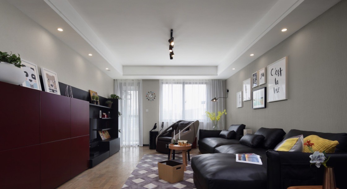 勃艮第红非常有爆发力,搭配高对比度的黑色系沙发、黄铜灯饰等元素中和,空间气质不会过于单一,更偏复合中性化。