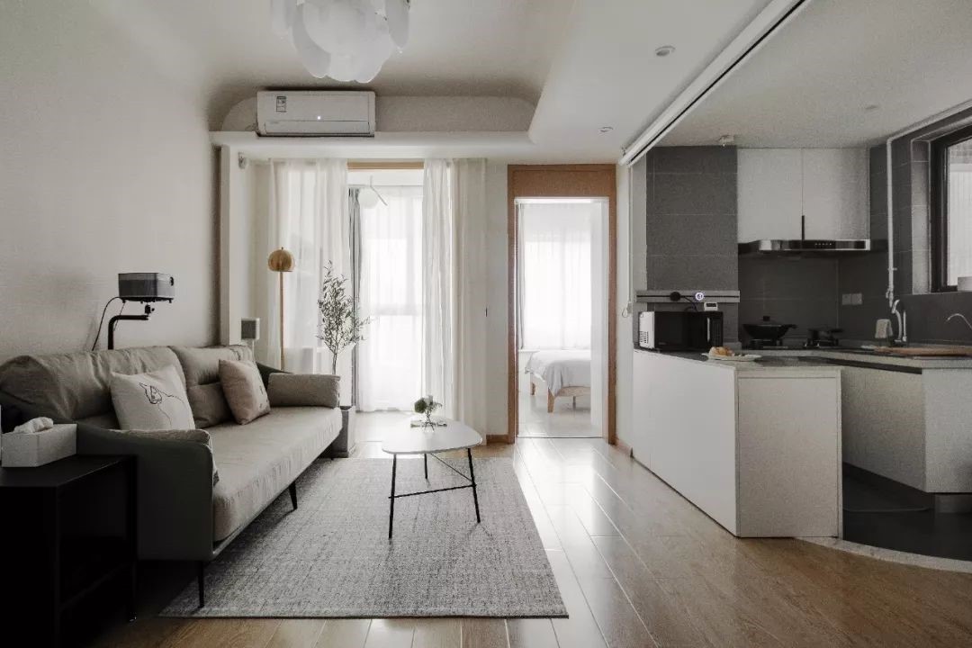 客厅空间,面积较小舍弃传统的主题电视背景墙设计,客厅对面就是开放厨房。