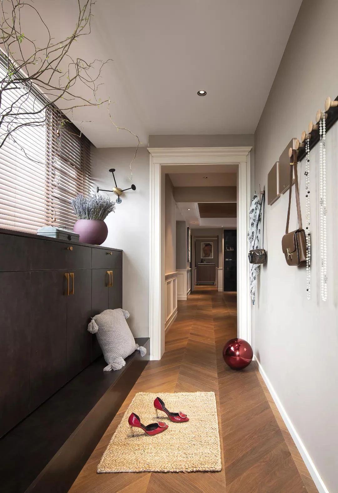 将玄关分为入户玄关和内玄关,强烈的纵深感,增加入户仪式感。