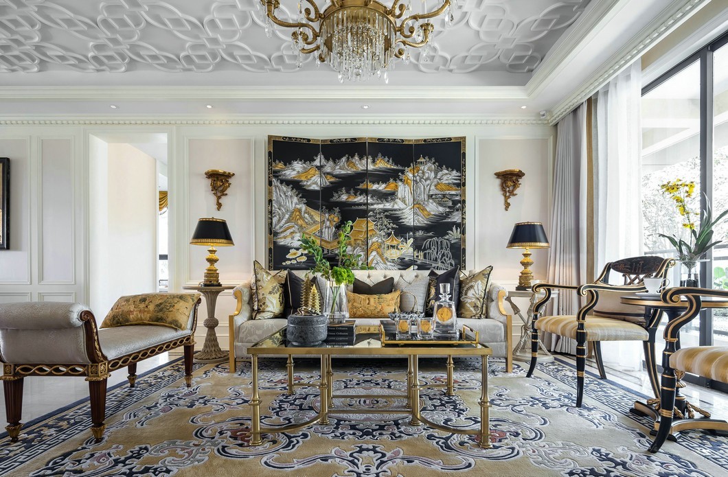 客厅沙发背景墙采用了黑金色的设计,搭配座椅和边几的黑金色花纹,使得整体更加的有质感。
