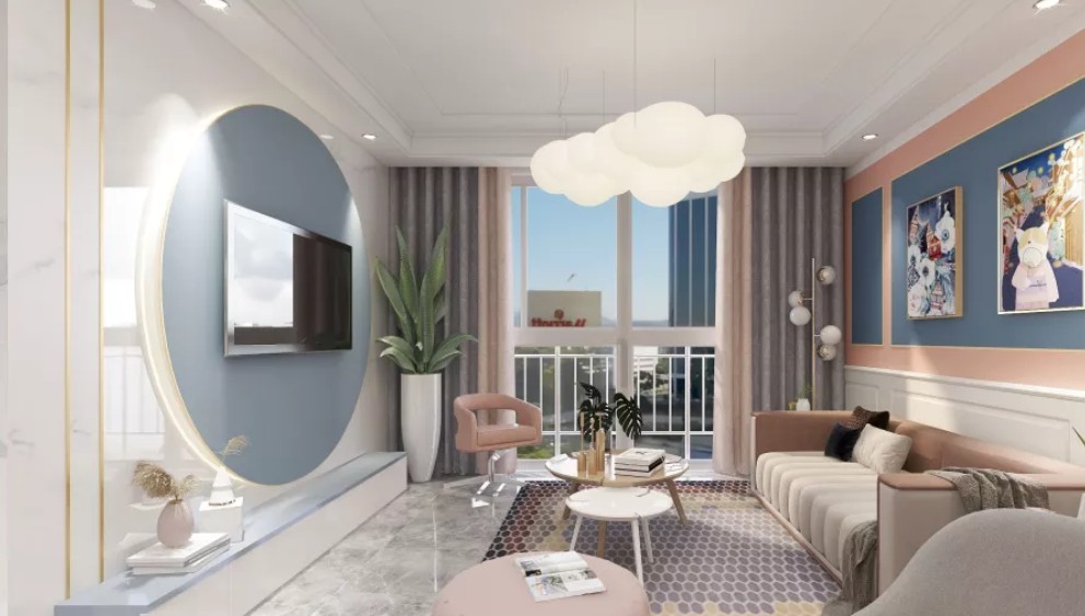 客厅蓝色的素雅搭配粉色的俏皮,暗示业主和他爱的女孩,交织在一起,可能这就是爱情吧。柔软的布艺沙发搭配圆形的电视背景墙,给人一种懒懒的舒适感。