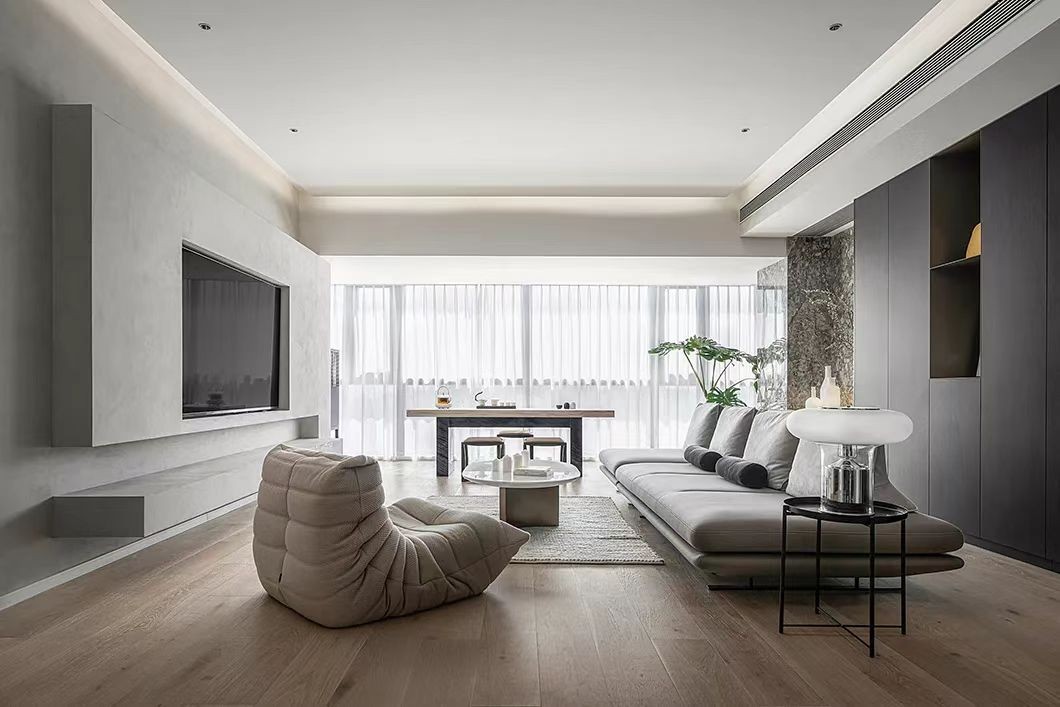 L型户型,常住人口三位,整体色系以灰色为主,让整个空间呈现一种带有生命力的呼吸感。