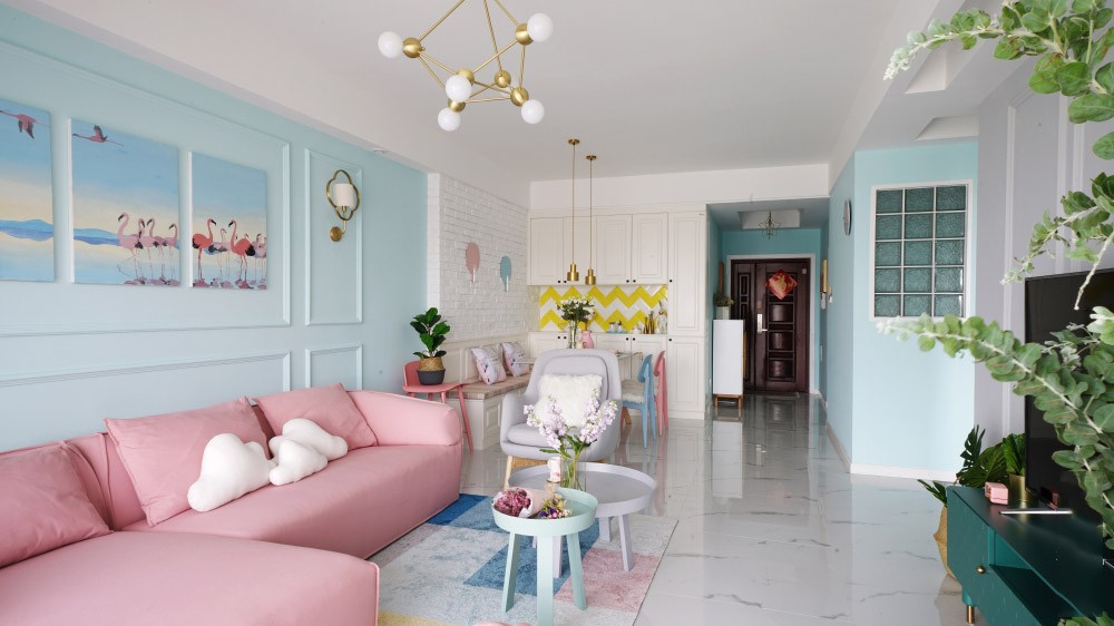 粉红色的布艺沙发,让空间更显清新时尚。