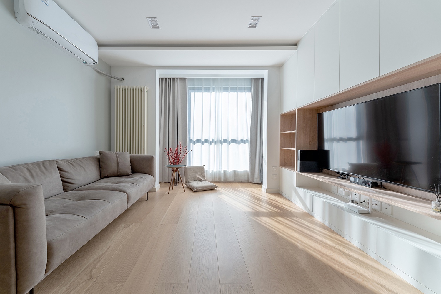 客厅采用了定制电视柜的设计,既整洁又美观,也满足了储物需求。