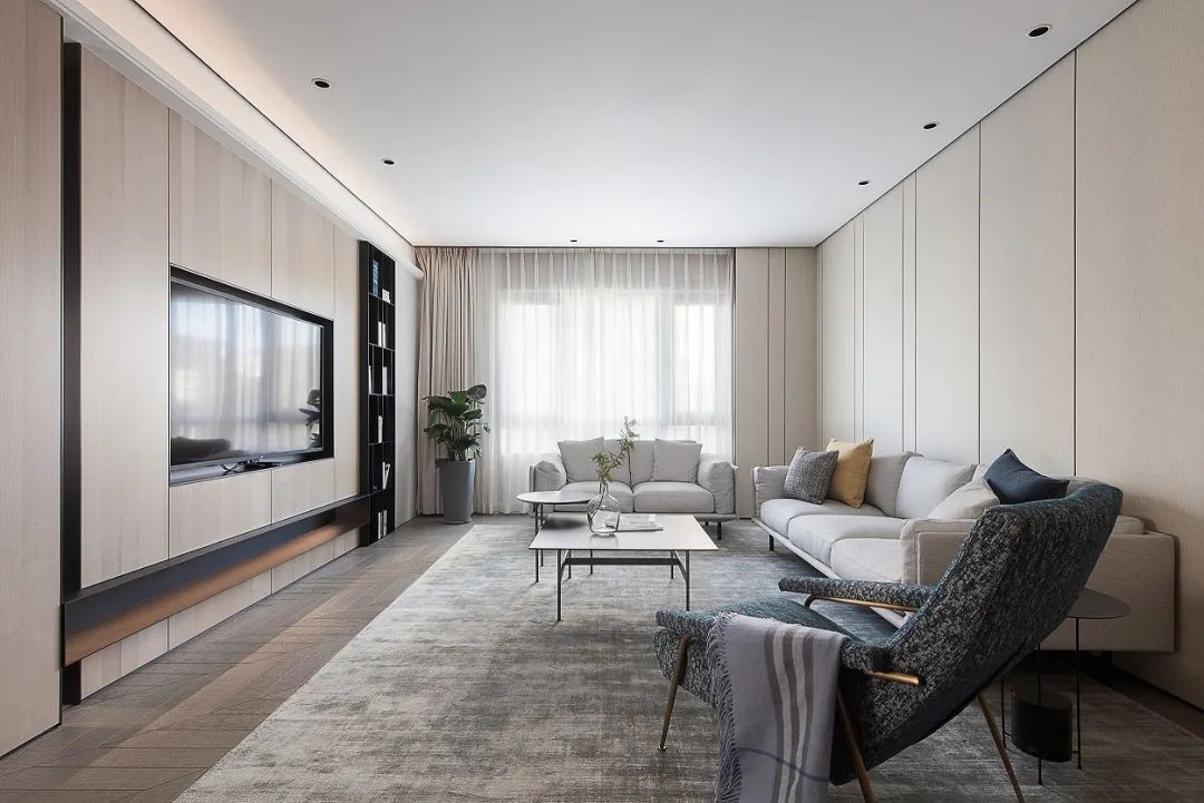 客厅以无主灯的天花设计,木饰面电视墙+硬包沙发墙的组合,木地板地面铺上灰色地毯,整体简约舒适的沙发、沙发椅布置,营造出一个简约自然的客厅氛围感。