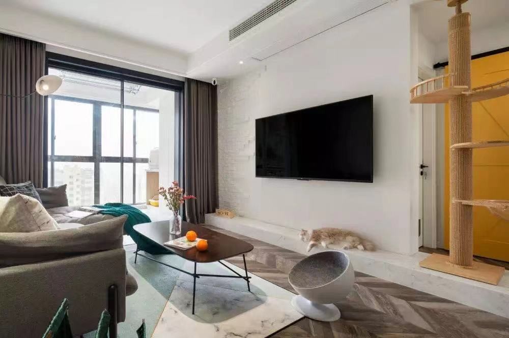 电视背景墙采用过度式设计,一断是文化墙砖的设计,另一端则是墙面,墙面的自然与纯净与大理石地台的花纹做出了强烈对比。