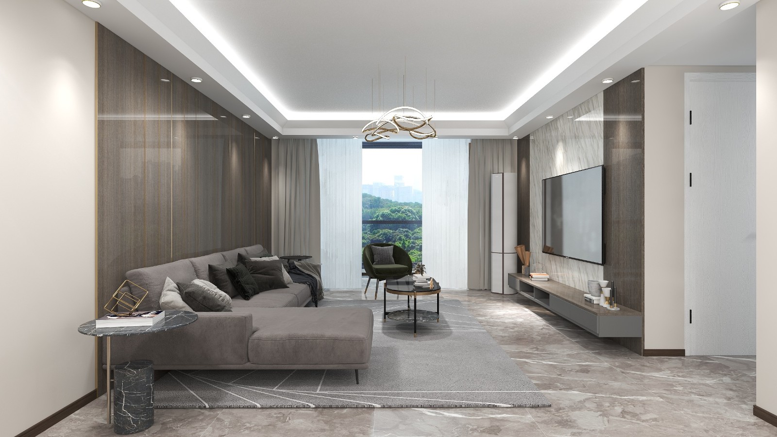 客厅:客厅背景墙采用护墙板+大理石的设计,层次丰富,L型的布艺沙发让整体色调一致,简洁大方。