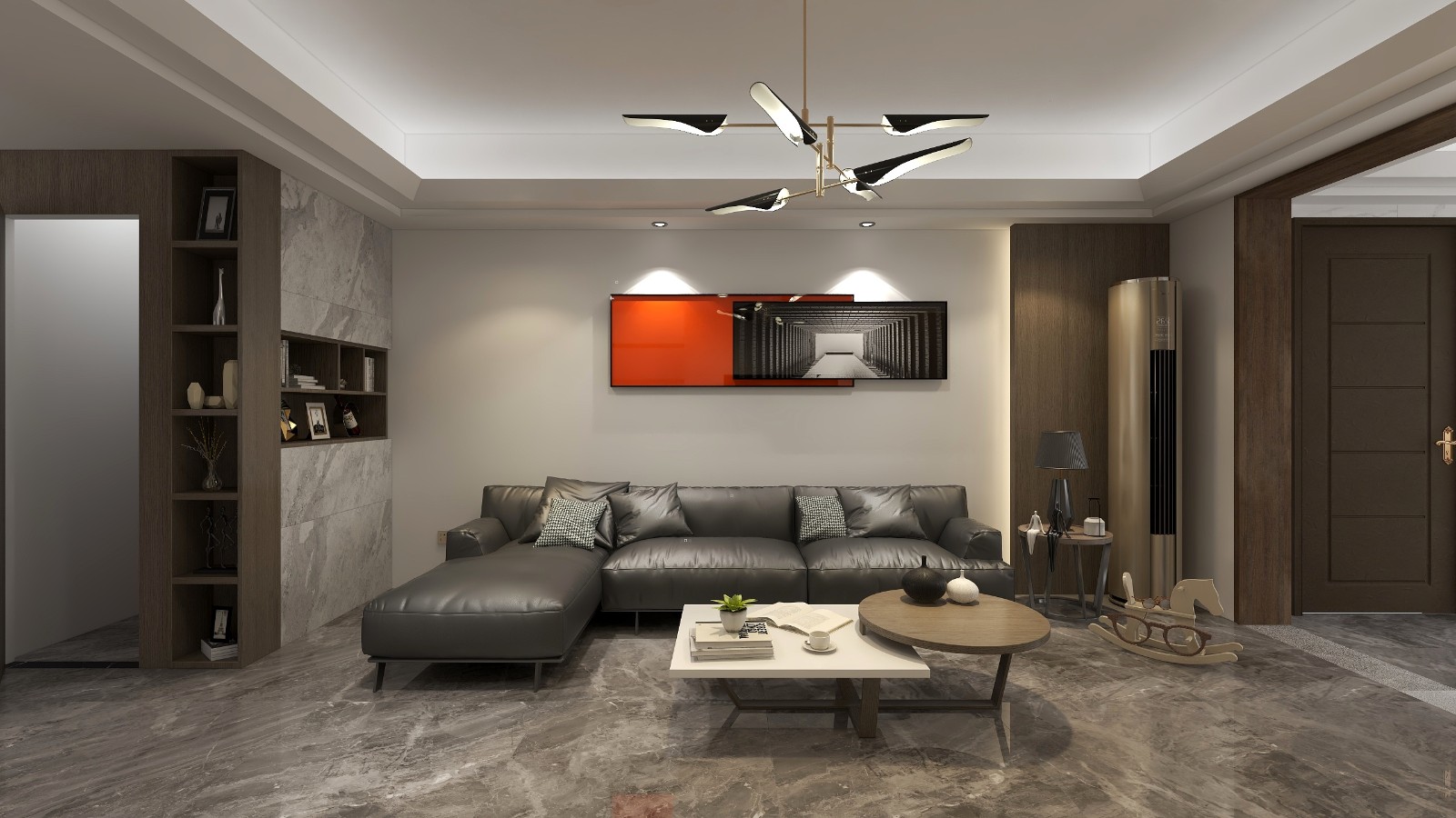 客厅的沙发为无彩色的低明度跟墙面的背景色形成呼应感,给人视觉的中心吸引,