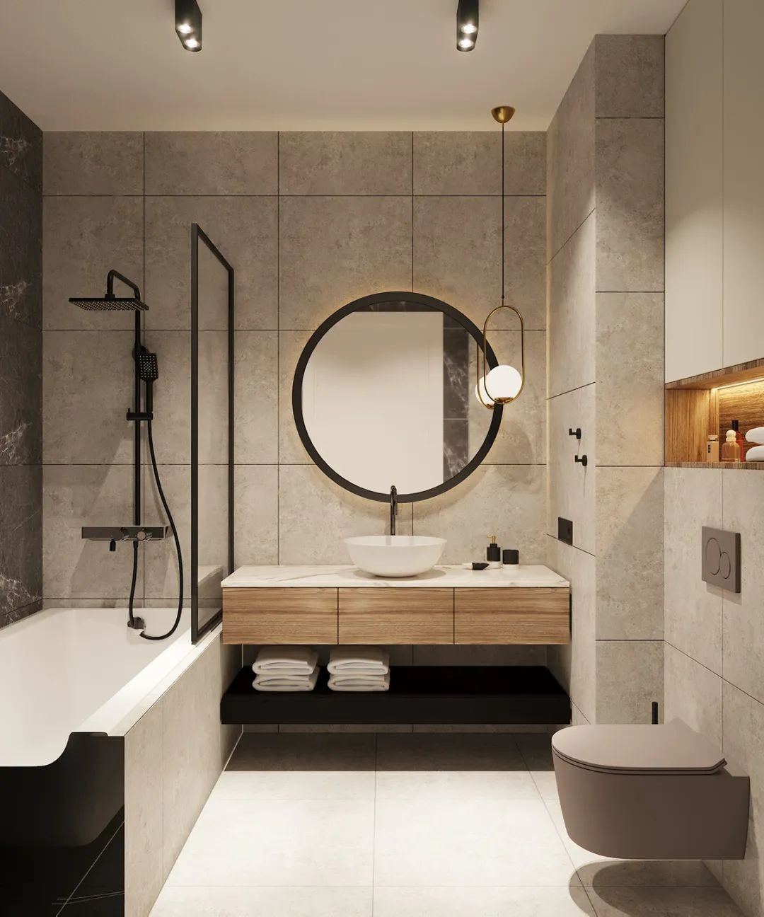 墙面采用600*600的亚光墙砖铺贴,搭配木制浴室柜与黑色洁具搭配。