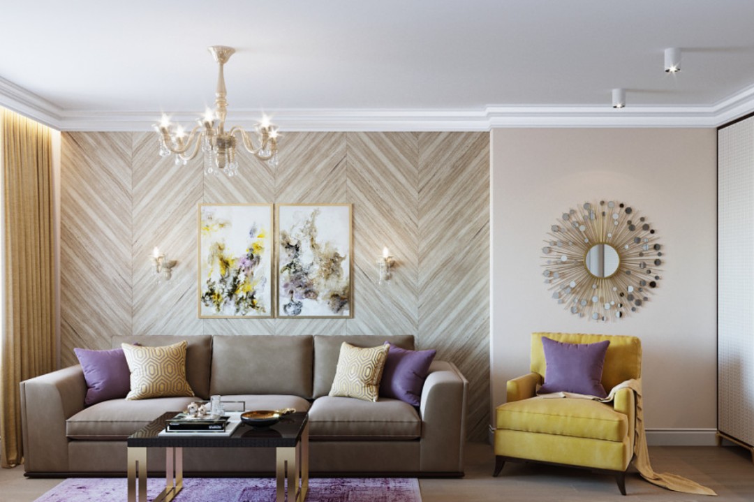 客厅空间整体采用了浅色的风格,紫色的地毯,黄色的单人沙发,跳色的搭配,也让空间显得更加的多样。