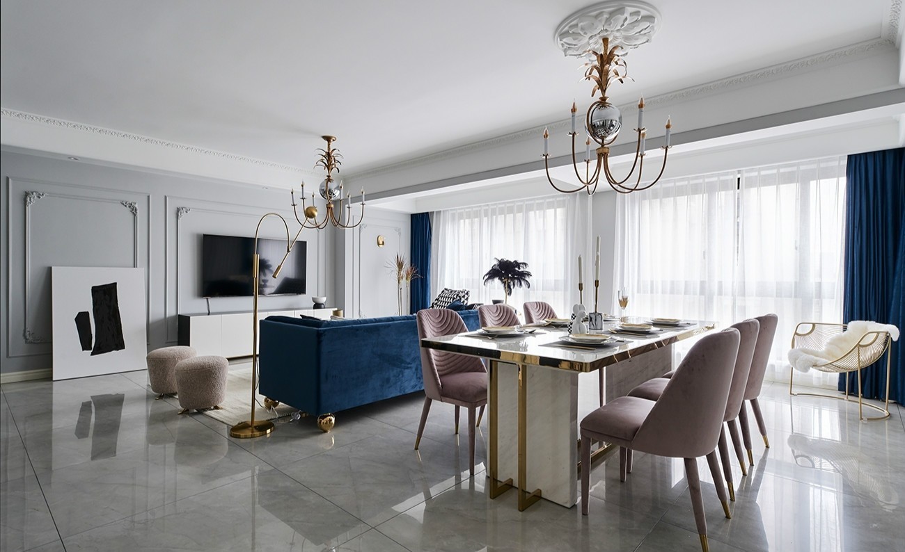 为了整体的统一性,主背景我们选用了浅灰色作为底色,局部的蓝、粉点缀搭配复古黄铜吊灯,使空间散发静谧与优雅的气息,家具的选择也非常特别,强化布料与主题色的运用。圆形脚凳有着笨笨的身躯,像两只企鹅,给空间带来了乐趣,阳光透过窗帘洒在身上,温柔的抚摸着空间的每个角落。