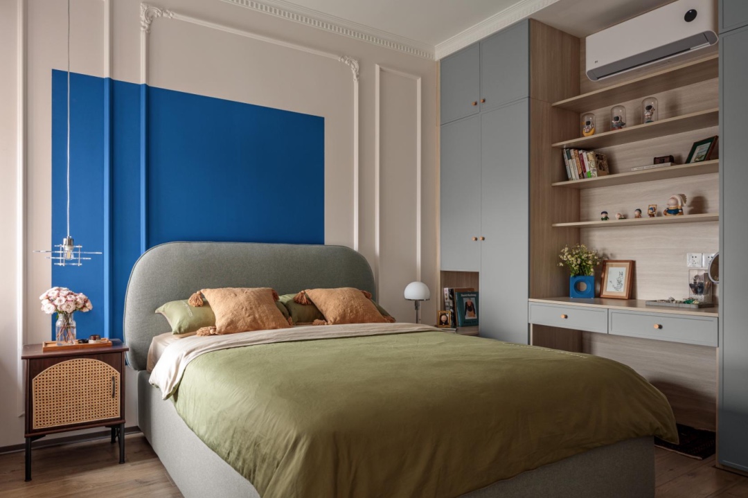空间以男女业主所偏好的绿色、蓝色为主色调,穿插温润的暖色,用大胆的撞色形成强烈的视觉冲击,表达出年轻居住者的个性与饱满的生活态度。同时设计师通过合理调整平面布局,使室内动线流畅,提升公共区域功能性和可塑性,让两人一猫在他们专属的暖屋里,过着简单温馨的小日子。