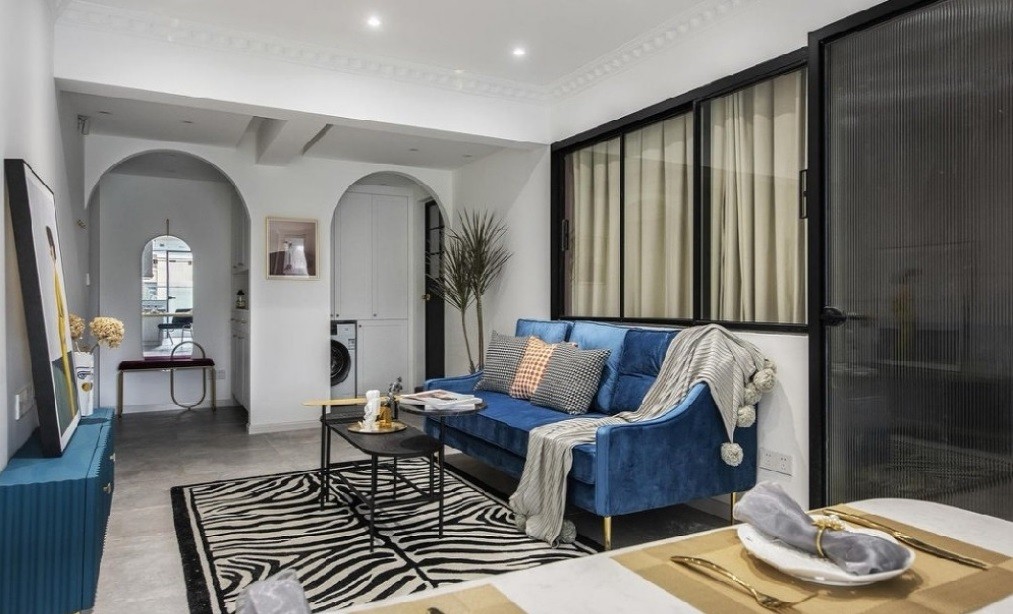 沙发后的玻璃门窗让空间通透,宝蓝色沙发鲜艳明快,让空间自然和谐.