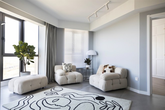 客厅、阳台通铺水泥灰地砖,形成整体视觉效果,空间显得更宽敞。客厅通往多功能房的大门,安装白色门套线,与地面的踢脚线融为一体,弱化了突出梁柱,实现了空间的自然过渡。