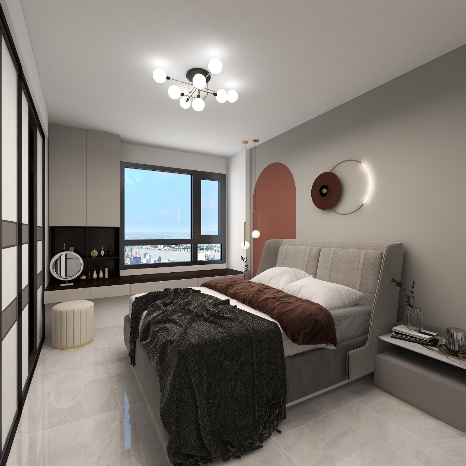 主卧改动不大,主要是增加储物空间,主卧作为相对私密独立的休憩空间,梳妆台、装饰挂件、投影仪,质感满满,给卧室增添了更温馨的气息