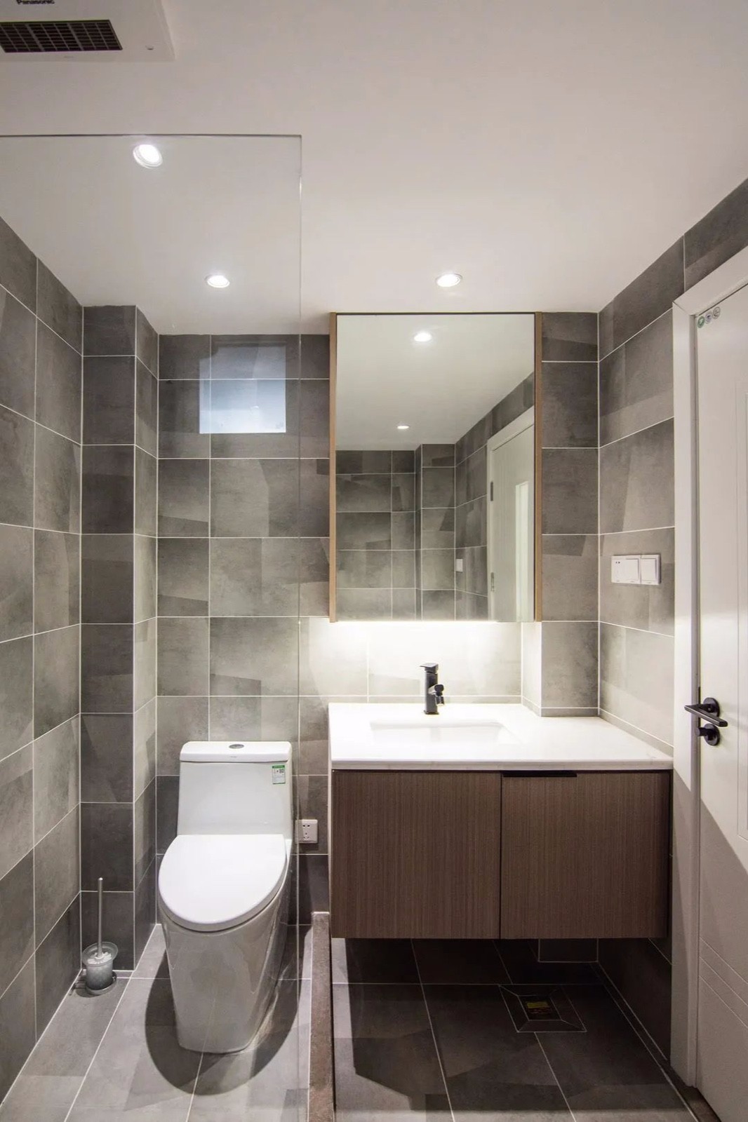 卫生间空间不大,但是灰色的瓷砖让卫生间看起来简洁大气了不少,该给洗衣机专门做了柜子,