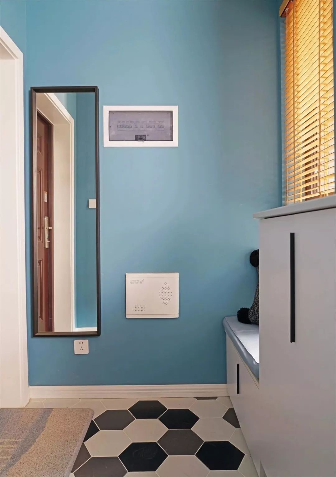 玄关开门就对着一个小窗,正好结合小窗装了一个换鞋凳+鞋柜组合收纳,地面在黑白灰三色六边砖基础,搭配蓝色墙面,墙面还配有一面全身镜,整体简洁优雅的空间,显得格外的实用温馨。