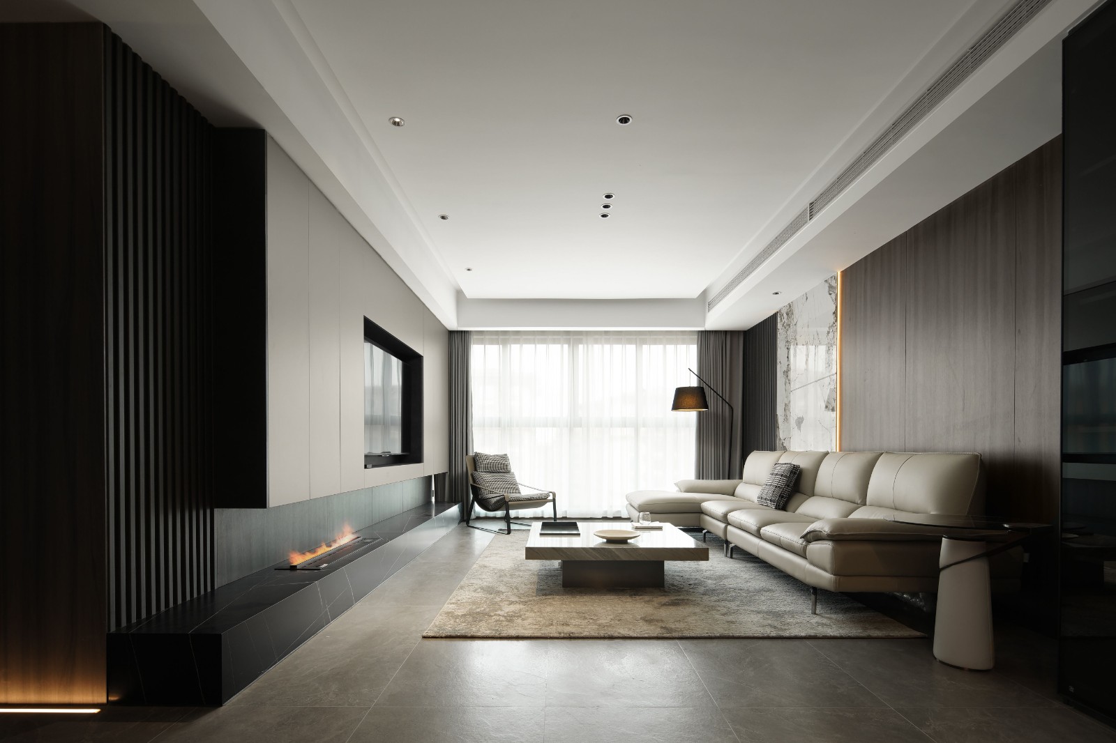 无主灯、满墙电视柜、岩板与墙板组合沙发背景,处处简约但不简单