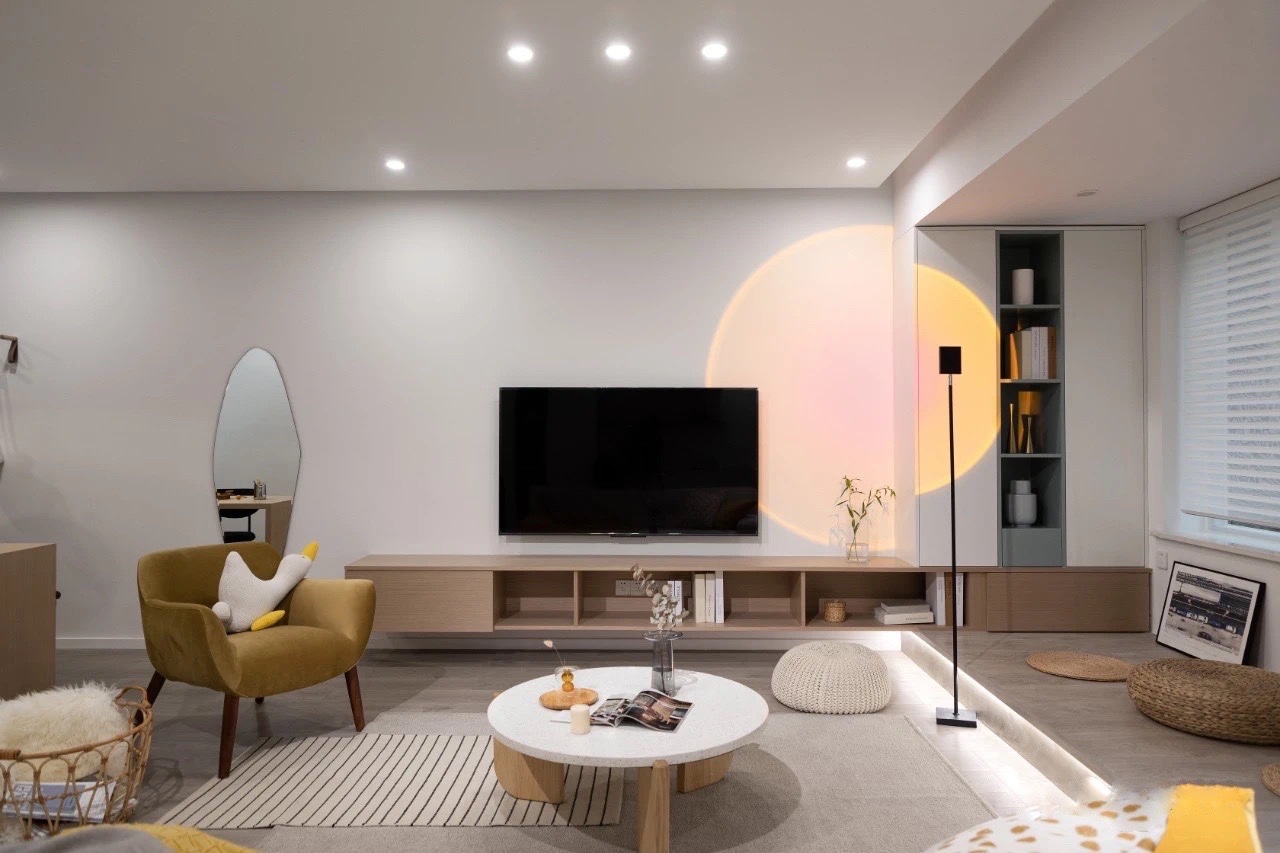 电视背景简单的电视柜没有过多的装饰,辅光源点缀。