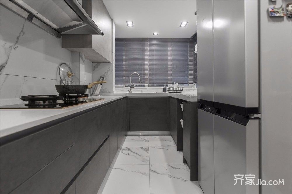 厨房的地板和墙壁都镶嵌了瓷砖,一则为了美观,二则便于收拾、耐脏。厨房以灰白色调为主,冷色调让厨房显得干净整洁但是略显灰暗,不过厨房的顶灯完美的解决了这个问题。