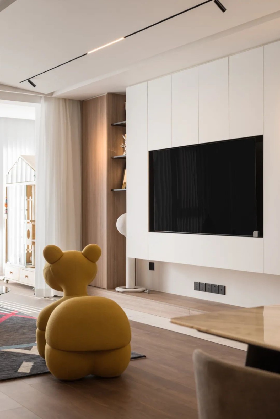 电视墙在装饰效果之上加入了储物及展示的功能,并留出L型的空间凹槽,避免视觉上过度的饱和感,并与进门处的白色鞋柜衔接。 木色地台转角与角落的木色储物柜的联通,自然而然的提升了整个空间的延伸感。