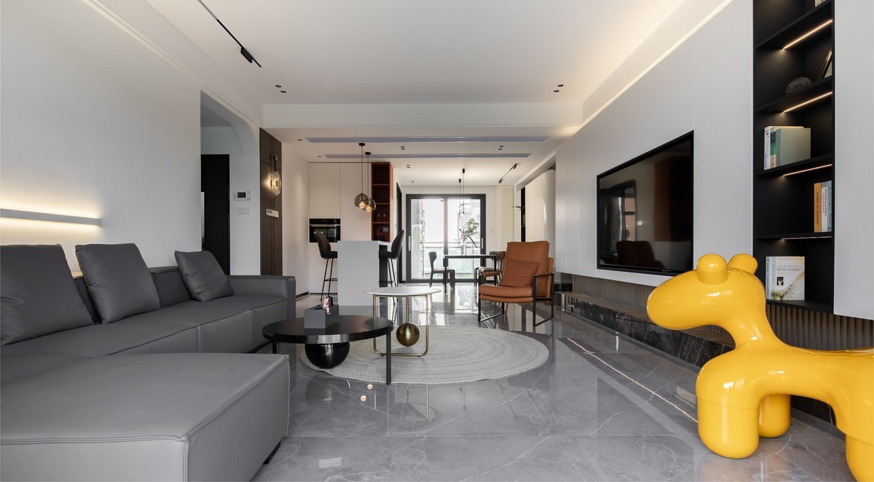 简约格调予以鲜明轮廓 富有生命力的美学张力和动态承载力 运用色相平静的黑白灰 演绎跳色、几何、质感组合交织后的 空间趣味和生活场景 于理性化的构造笔法间 插入柔和、温暖的元素 调和着居住体验感 拥有开阔光感的留白底色将一切 沉淀在设计形态与生活情趣中 此中含彼,彼中寄此的空间 互动传递着关于“和”的哲思