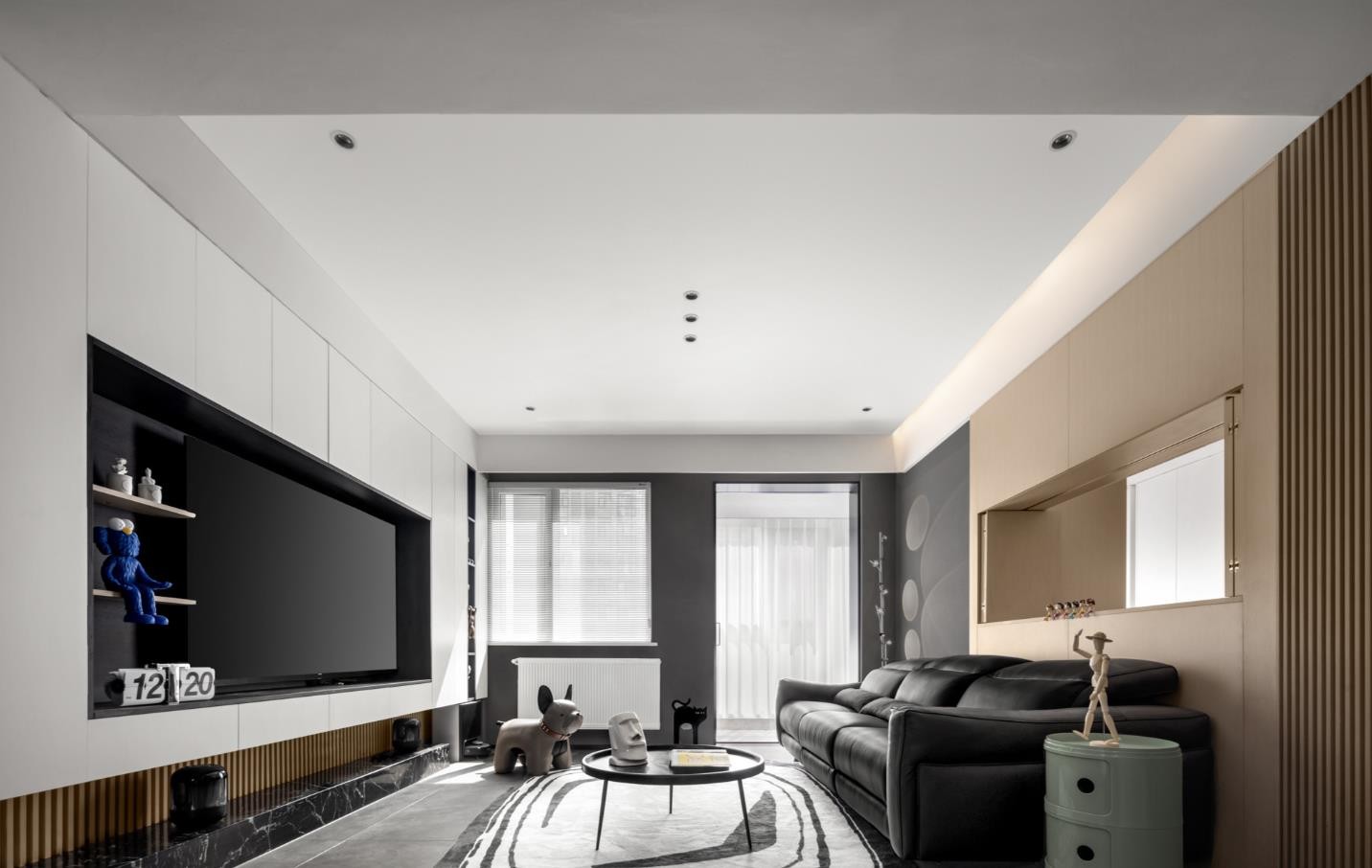 整个家以黑白灰为主色调,耐看的简约风经得起时间考验,越住越喜欢。 从走道延伸至电视背景墙的一整面柜子,满足了手办展示、玩具收藏、杂物收纳等多重功能,还将电视机的杂乱线缆藏于无形。大理石地台上摆放着屋主喜欢的音响,享受更好的视听体验。