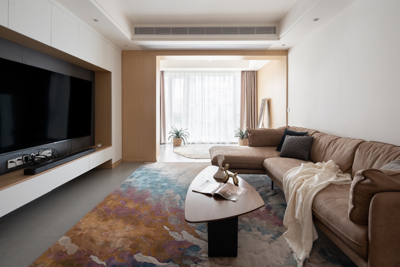 顶部大面积留白,视觉上拉升空间层高,让空间更加立体。沙发立面增加木色护板墙,为空间增加了丰富的光影效果,也赋予了空间素净的暖意。