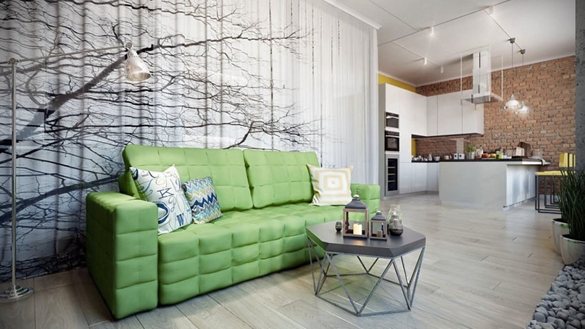 整体以灰打底,配以原木色家具拉近彼此距离。一抹松石绿赋予客厅灵魂,简约清新。