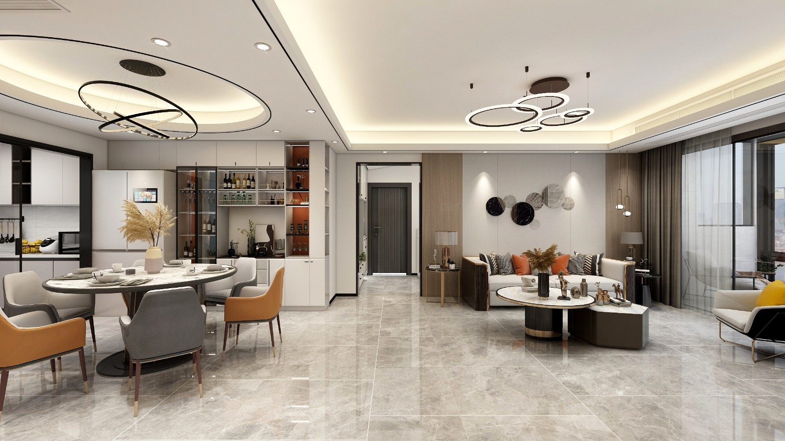 需要酒柜,双开门冰箱,圆形餐桌,方便接待更多的客人