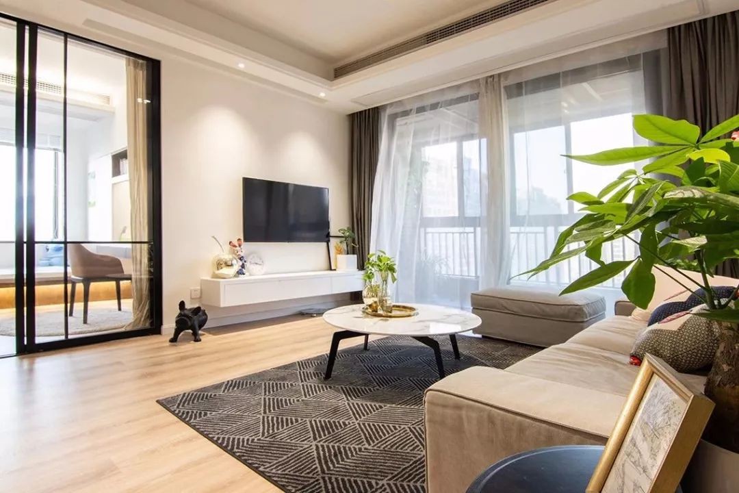 客厅整体原木质的木地板,简约舒适的空间下以浅灰色布艺沙发,搭配深灰色地毯与大理石质感的圆形茶几,整体带来的是一个优雅的档次气质。