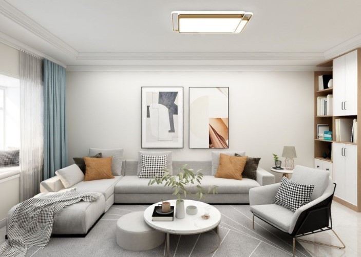 现代简洁的客厅,灰色与米色的搭配,还有黑白配的点缀,整个空间显得简洁明亮而时尚大方。