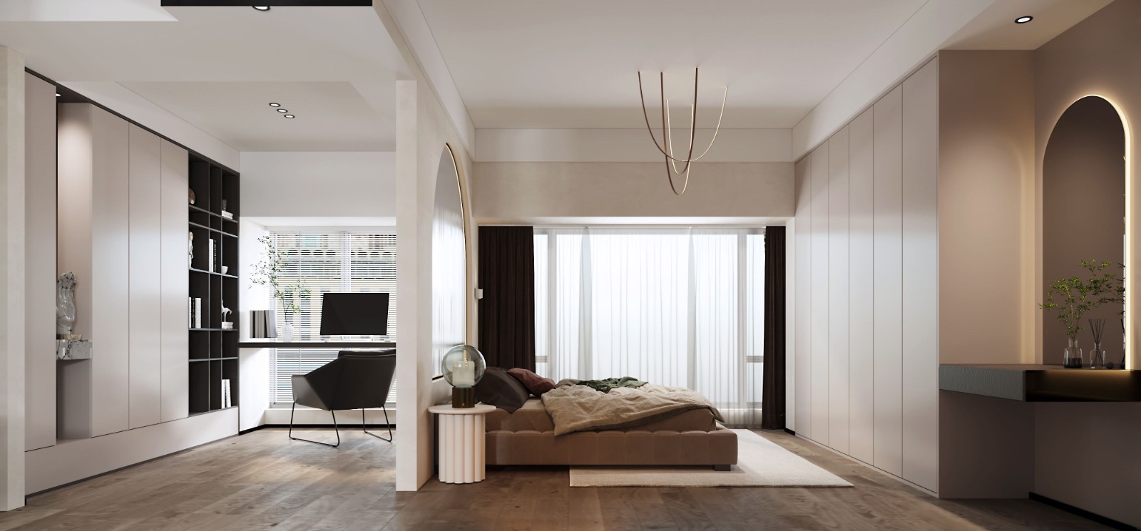 主卧空间背景采用弧形长虹玻璃作为书房与起居室的空间阻挡造型,缓和了空间的直型线条带来的生硬画面,为空间添加了不一样的画面审美感。