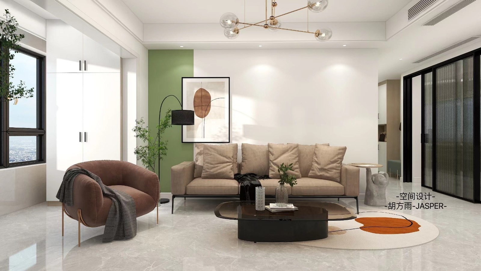 现代简约风,白色乳胶漆与绿色乳胶漆的相互集合,使得原先的墙体不是那么呆板却又生动活泼,也达到了墙面的设计感,与沙发茶几软装方面的互相色彩融合