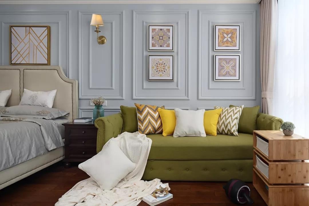 卧室的床头背景墙做了很有美式风的石膏线护墙板造型,两侧对称的壁灯和中间的挂画搭配软包的床,给人一种优雅感。
