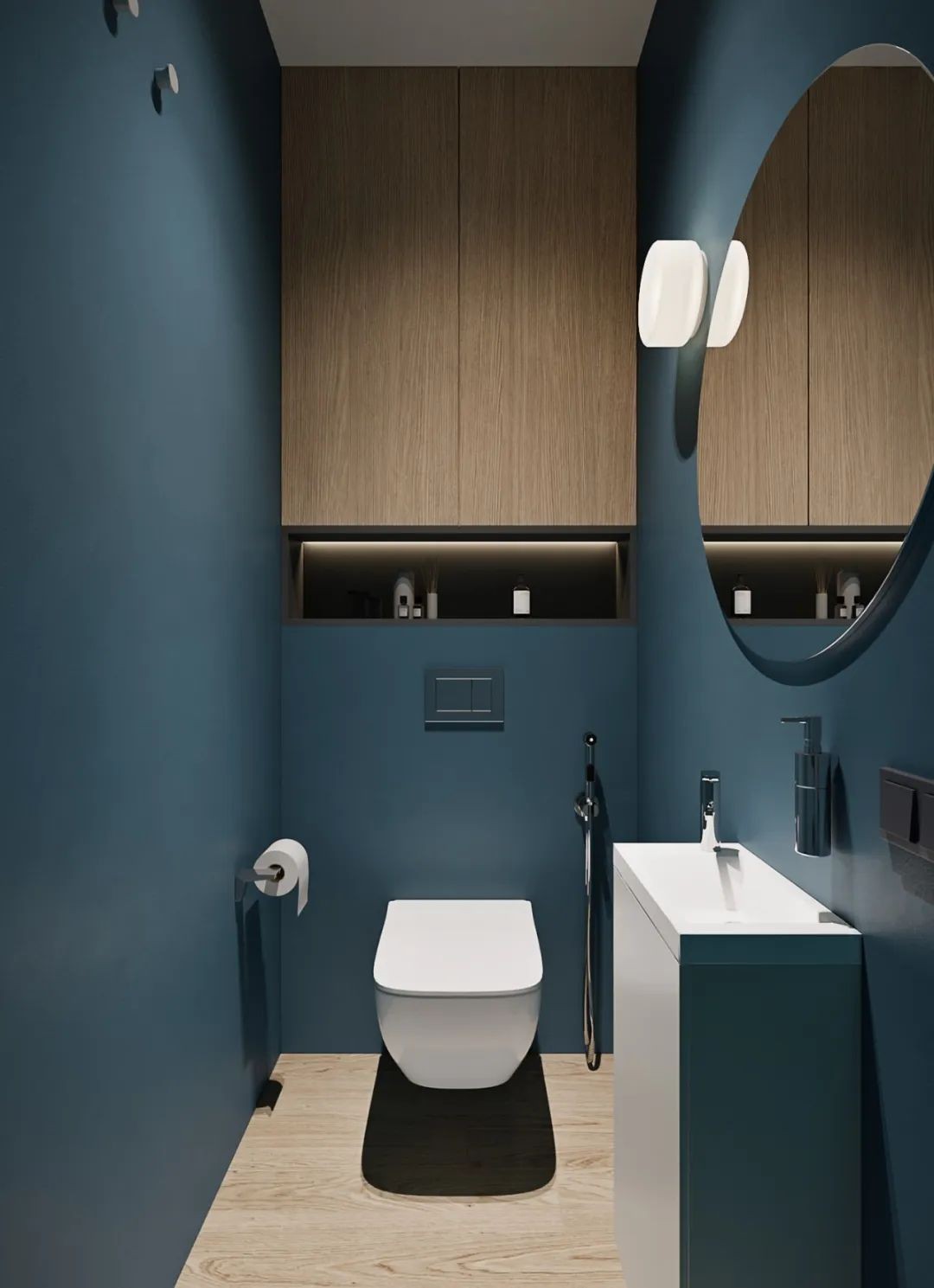 卫生间用简单的隐藏式马桶,马桶上做柜子节省空间,简洁的圆形镜面,搭配深色的墙砖更美观