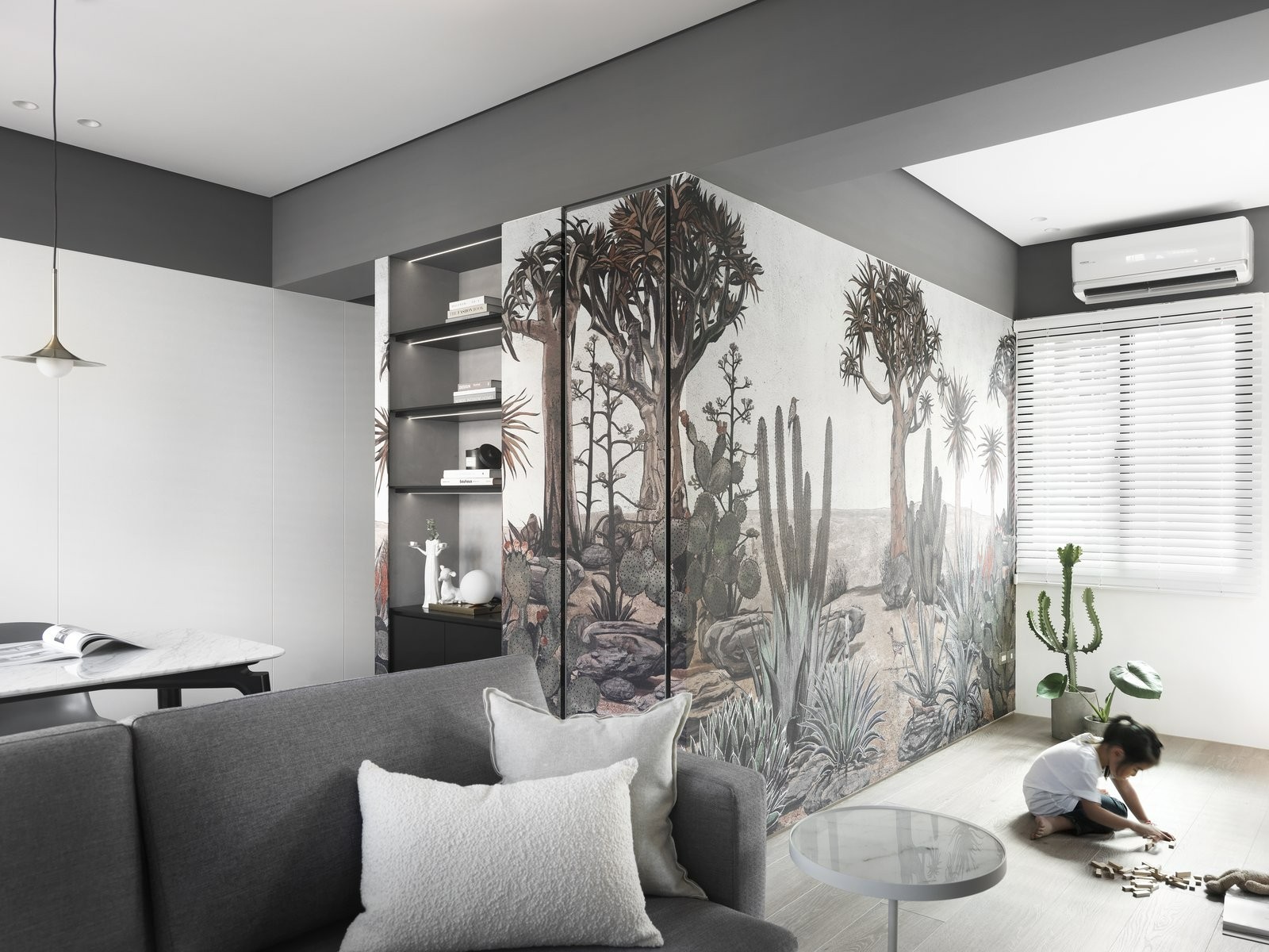 白色调为主,灰色调为辅,从家电到硬装都是精挑细选搭配的。地面配合客厅风格做成了整体的风格,从而在空间上增加延伸感。