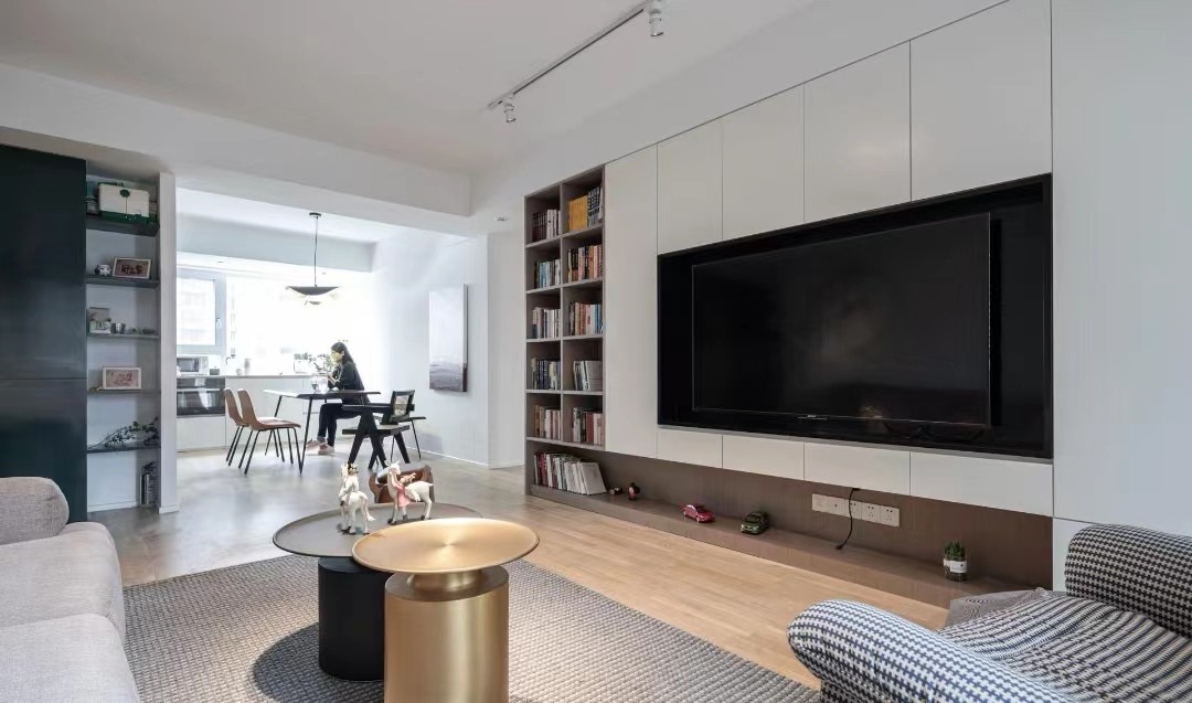 墙面做了书柜与电视背景墙,扩大客厅视野,同时将沙发墙背景大面积留白外加一排柜体代替,增加收纳,丰富功能,颜色上面运用柔和的白色,营造一份安逸且舒适的居住氛围。