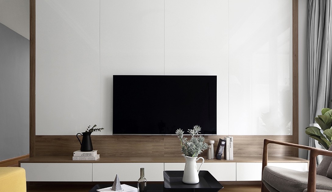 电视背景墙以木色+亮白色搭配,定制的电视抽屉柜也解决了客厅的储物需求,也可作为展示区域。
