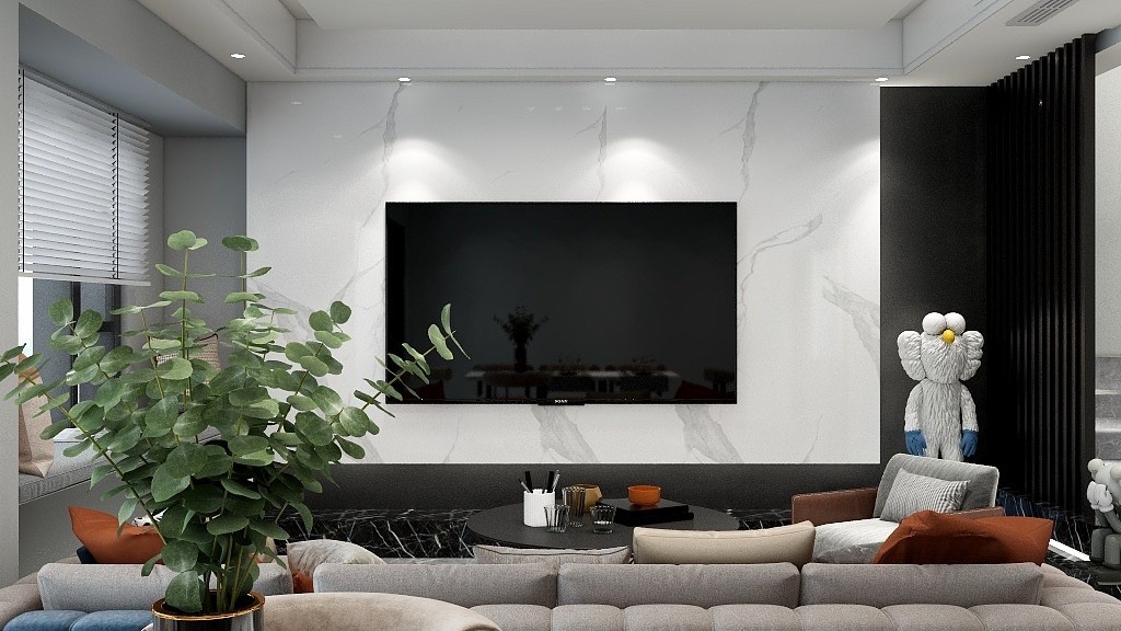 电视背景墙采用石材上墙整体黑白灰搭配成为整个空间中的亮点