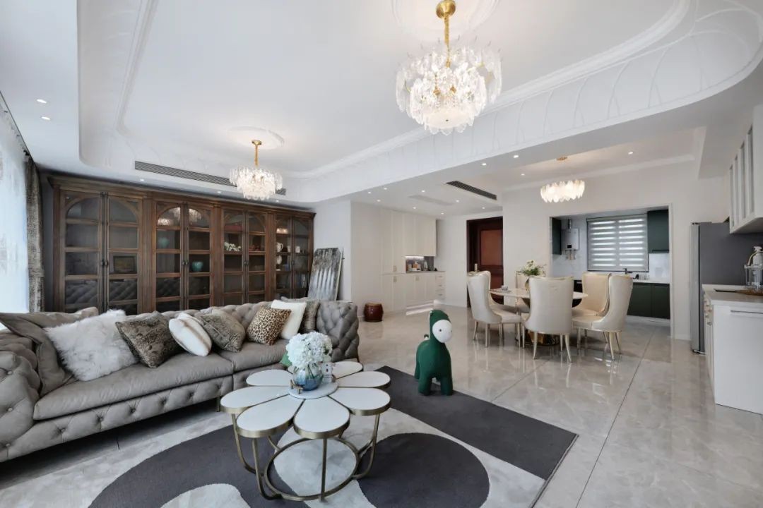客餐厅一体化,开放式的设计让空间显得更加宽敞通透,光线和视野都非常好。还可以保证空间风格氛围的连贯性,整体性和协调性更强。设计师利用吊顶造型分隔客厅与餐厅,选用雕花和吊灯体现空间的精致感。
