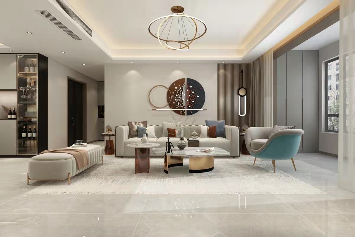 客厅;.客厅地面采用浅色灰系地砖很好的贴合装修风格,背景墙用挂饰中和颜色的单调,用线条造型来增加质感。
