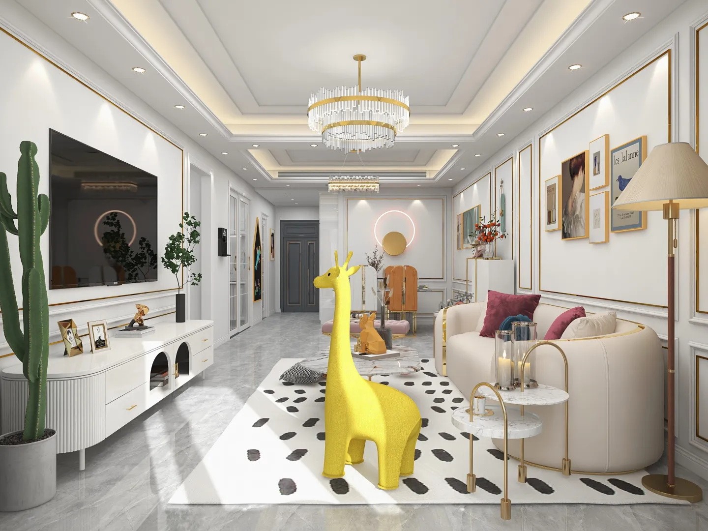 客餐厅背景墙用了pu线条和金属线条,灰色地砖通铺,简简单单且不失精致。