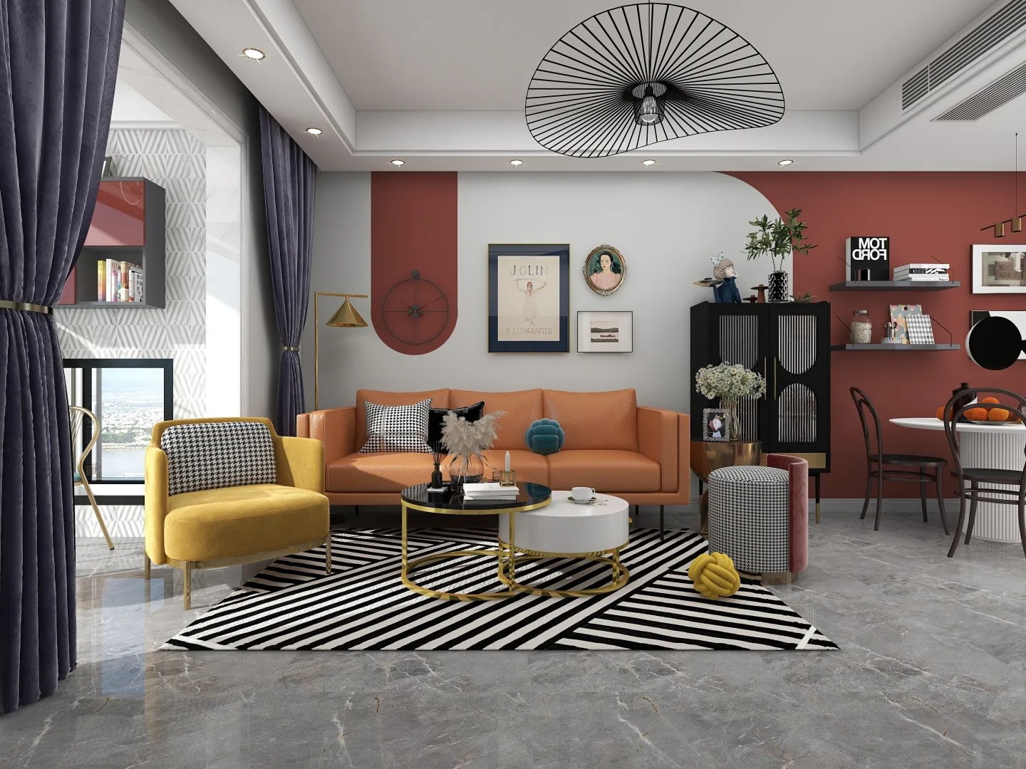 过道复古红的拱门造型***感满满,更能使电视背景墙得到延伸