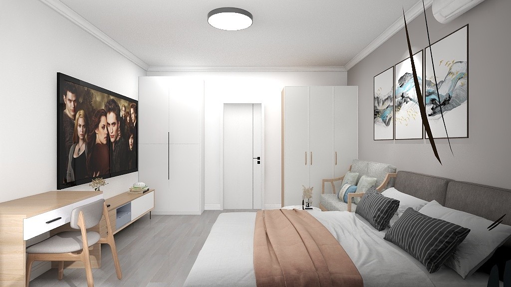 次卧全屋买成品家具, 做窗帘盒,全屋刷淡灰色墙漆。