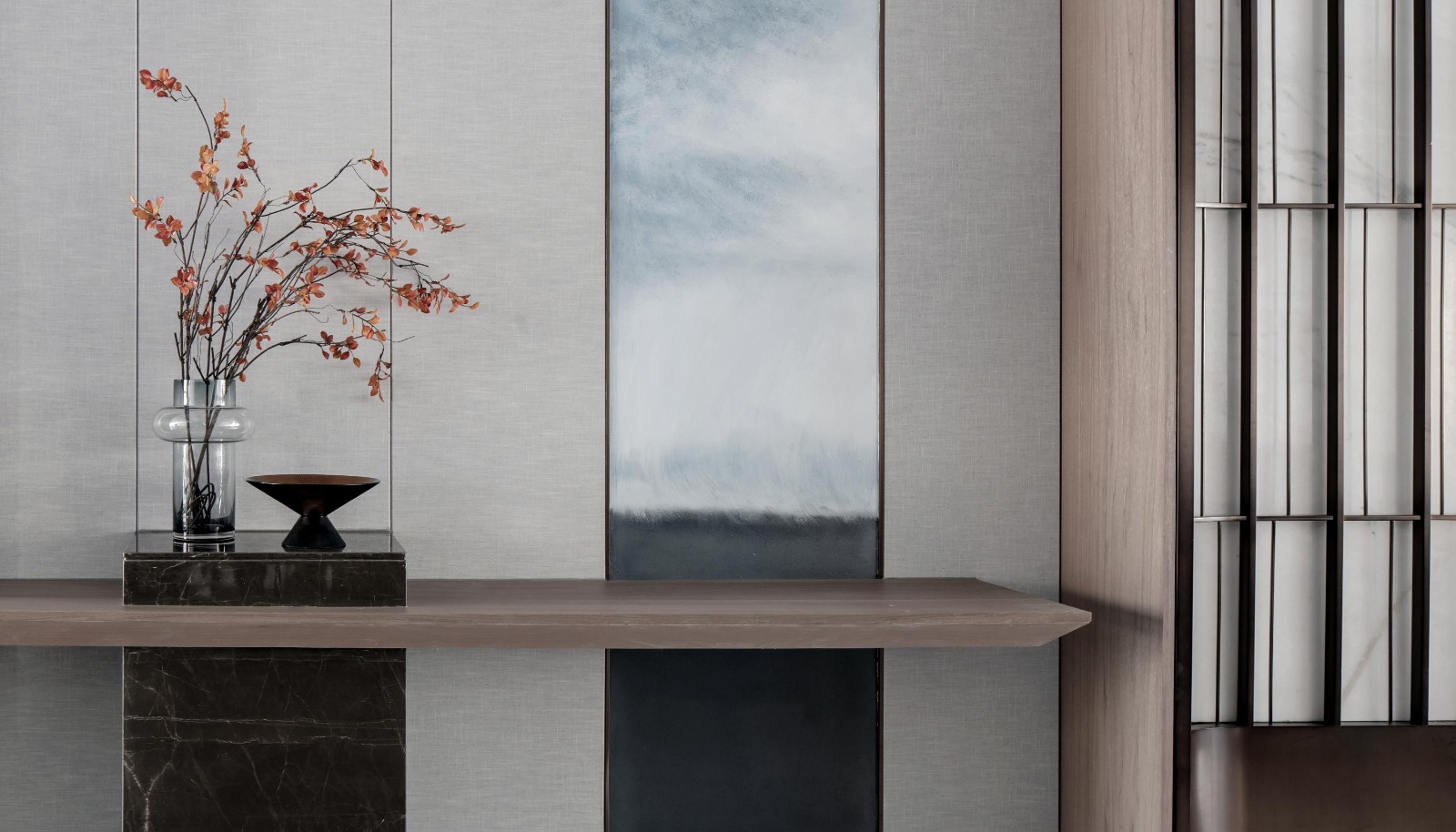 步入屋内,大理石与胡桃木定制造型的端景台与冷调定制墙画相互衬映,柔与刚、动与静之间赋予空间灵动的生命力,提炼宁静与安逸的环境和谐之美。